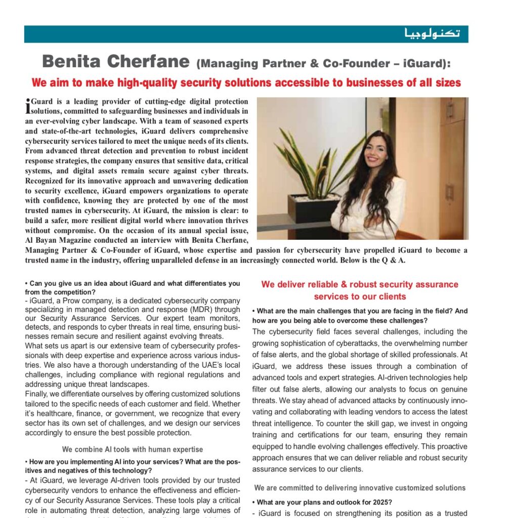 At iGuard, the mission is clear: to build a safer, more resilient digital world where innovation thrives without compromise. On the occasion of its annual special issue, Al Bayan Magazine conducted an interview with Benita Cherfane, Managing Partner & Co-Founder of iGuard, whose expertise and passion for cybersecurity have propelled iGuard to become a trusted name in the industry, offering unparalleled defense in an increasingly connected world. Below is the Q&A.